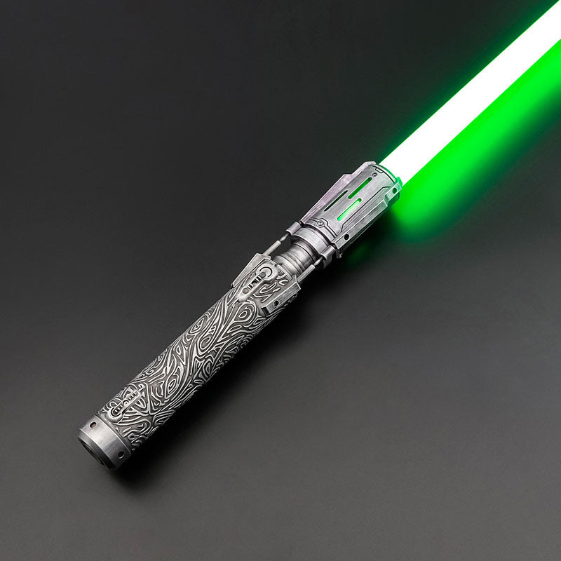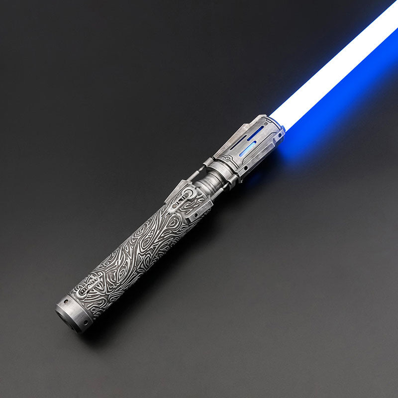 The saber's unique design elements set it apart from the rest of the Ycsabers lineup. Nine staggered, vertical windows wrap around the elegant emitter, which is tri-sected by a distinctive set of pins securely attaching it to the hilt. The hilt itself is adorned with a gorgeous engraved pattern that fully wraps around, creating a one-of-a-kind aesthetic.
