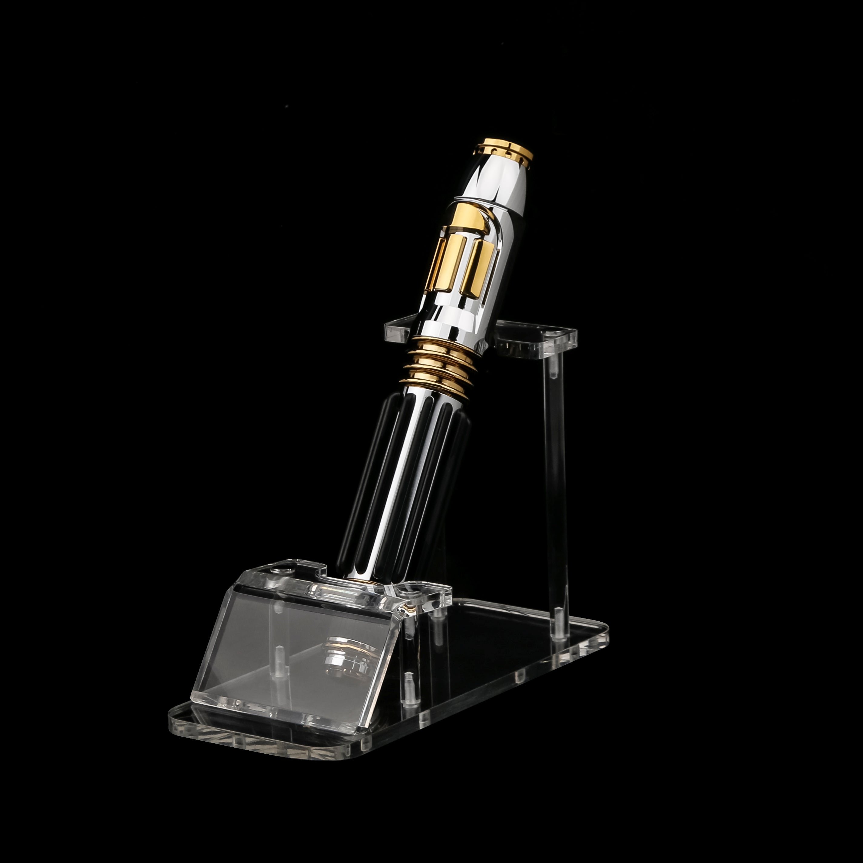 The gold-plated emitter features a circular design with small light-diffusing holes, enhancing the blade’s luminous effect, and includes a belt connector for easy carrying. Built with high-quality materials, this saber boasts rich sound effects and customizable blade colors, making it a detailed collectible ideal for enthusiasts of sci-fi weaponry and cosmic adventure lore.